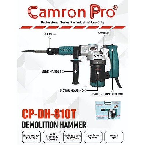 The Camron Pro Cp-Dh-810T Demolition Hammer Is A Powerful And Reliable Electric Corded Tool Designed To Meet The Demands Of Professional Contractors And Diy Enthusiasts Alike. Featuring A Robust 1200W Input Power And Operating At 220-240V With A Frequency Of 50-60Hz, It Delivers A High No-Load Speed Of 3600T/Min For Efficient Breaking Performance. Its Ergonomic Blue And Black Design Houses A Durable Hex Tool Holder And A Convenient Switch Lock Button For Continuous Operation, All While Maintaining A Manageable Weight Of 5Kg. Engineered For Precision And Endurance, This Demolition Hammer From Camron Offers Exceptional Value, Aligning Perfectly With Our Commitment To Providing Trusted, High-Quality Tools. Shop With Confidence At Camron, Where Professional-Grade Tools Meet Unmatched Service.