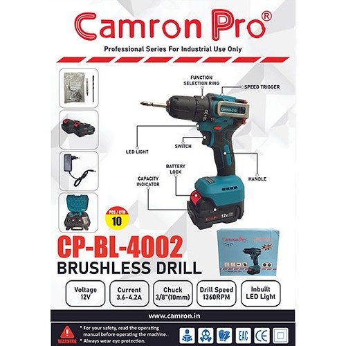 The Cp-Bl-4002 Brushless Drill From Camron Pro Is A Reliable Cordless Tool Designed For Efficiency And Ease Of Use. Featuring A Powerful 12V Motor With A No Load Speed Of 1360Rpm, This Blue Drill Offers Consistent Performance With A 10Mm Chuck Size And Current Range Of 3.6-4.2A. Equipped With A Switch Lock Button For Safety And Control, It Ensures Precise Operation On Various Tasks. This Cordless Drill Embodies Camron’S Commitment To Quality And Customer Satisfaction In Every Tool We Provide. Upgrade Your Toolkit With A Durable, High-Performance Option From Camron’S Trusted Online Shop.