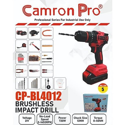 The Camron Pro Cp-Bl4012 Brushless Impact Drill Is A Powerful Cordless Tool Designed For Both Professionals And Diy Enthusiasts, Delivering 730W Of Input Power And A Torque Range Of 0-50Nm For Efficient Drilling And Fastening. Featuring A 21V Battery And A 13Mm Chuck Size, This Red And Black Drill Operates At A No Load Speed Of 1450Rpm, Ensuring Precision And Control On Every Job. The Built-In Switch Lock Button Enhances User Safety And Convenience During Extended Use. This Drill Embodies Camron’S Commitment To Providing Reliable, High-Performance Tools That Meet The Demands Of Your Projects. Shop With Confidence At Camron, Your Trusted Online Tool Shop For Quality And Durability.