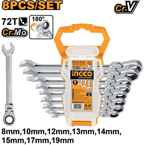 Ingco  8 Pieces Combination Ring & Open End Flexible Gear Wrench Set
